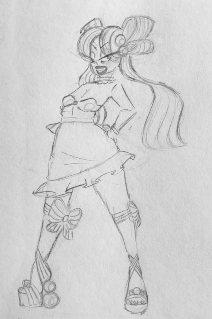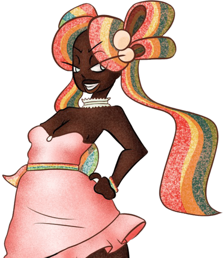 With the major focal points out of the way, I moved onto designing a simple yet visually interesting dress, keeping the colour light as to not clash with the vibrancy of the rest of the design. Originally, I had sketched her with a bikini top & skirt, but later on adjusted it to just a dress. As final touches, I brought back the sour strips as small details, such as the bracelets & the belt.