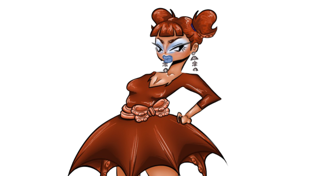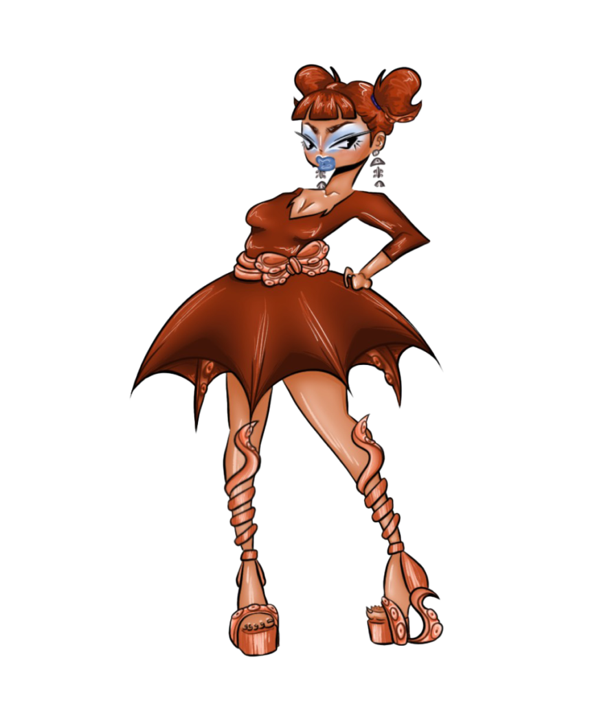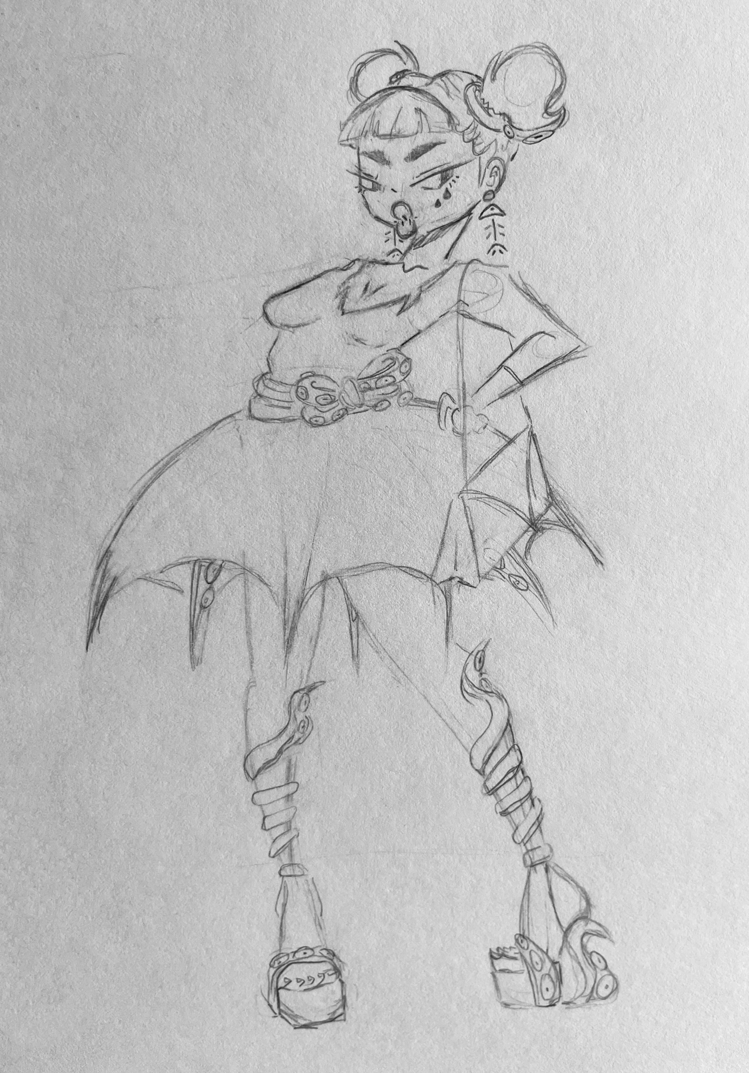 Starting with the hair, I was very inspired by the fins at the top of their heads. To me, it looked like two little pigtails. I also gave her baby bangs reminiscent of gothic hair styles, seeing as she’s a vampire squid.